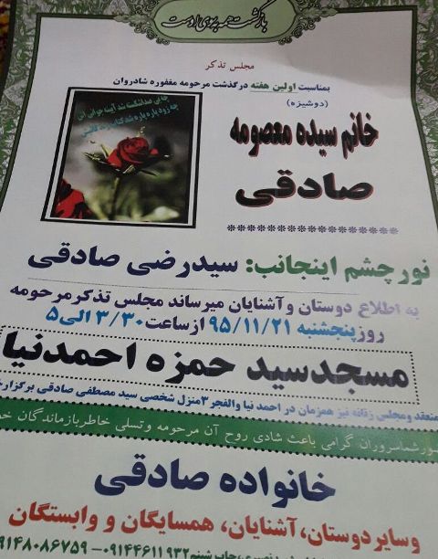 ضمنا مراسم تشییع وتدفین آن مرحوم روز شنبه 95/11/23 ساعت 9/30 واقع در مابین میدان توحید و خیابان آزادی کوچه حاج رضایی انجام خواهد شد . وسیله ایاب و ذهاب هم در خیابان فرصت نزدیک کوچه شان آماده خواهد بود .