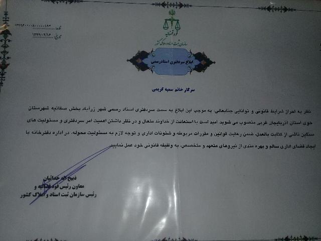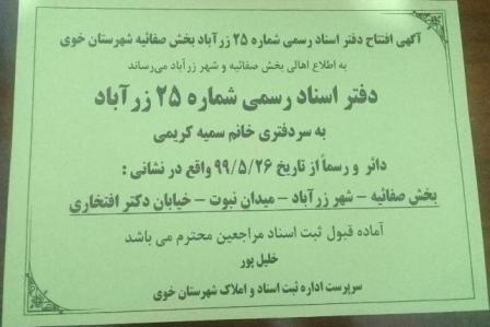 با سلام وبا افتخار افتتاح دفتره شماره 25 زرآباد بخش صفائیه شهرستان خوی به سر دفتری خانم سمیه کریمی خواهر زاده عزیز م را به خدمت خود آن عزیز وخانواده محترم کریمی بویژه داماد عزیزمان جناب آقای عباس کریمی وخواهر عزیزم مصری خانم وتمامی فامیلها ونزدیکان ارجمند وخاله ها ودایی وعمو وعمه های محترم وخواهر زاده های نازنینم واهالی محتر م زر آباد وعلیشیخ ومنطقه صفائیه ومسئولین محترم ودهیاری محترم علیشیخ وشهردار محترم زر آباد تبریک وتهنیت عرض میکنیم وموفقیت هر چه بیشتر سمیه خانم رادرراه خدمت به ملت ومملکت وجمهوری اسلامی از در گاه خداوند متعال مسئلت مینمائیم ارادتمند دایی یحیی وخانواده